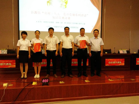 7月12日下午,由縣委組織部舉辦的“喜迎十九大-黨章黨規(guī)系列講話”知識(shí)競賽活動(dòng)最后決賽階段的比賽在縣委黨校二樓舉行,經(jīng)過預(yù)賽篩選,共有六只代表隊(duì)進(jìn)入決賽。本次比賽共設(shè)個(gè)人必答題、團(tuán)體必答題、搶答題、風(fēng)險(xiǎn)題四種題型,經(jīng)過激烈的比賽,我公司代表隊(duì)獲得了二等獎(jiǎng)(第三名)的好成績,第一名被地稅局代表隊(duì)獲得。公司黨委在活動(dòng)中高度重視、精心組織,榮獲優(yōu)秀組織獎(jiǎng)。圖為比賽現(xiàn)場。