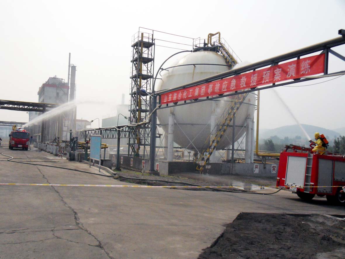 2012年6月21日上午,公司在東廠區(qū)液氨罐區(qū)舉行液氨泄漏應(yīng)急救援演練。縣安監(jiān)局、環(huán)保局、消防大隊(duì)、衛(wèi)生局、縣內(nèi)其他?;菲髽I(yè)和公司領(lǐng)導(dǎo)及部分員工觀摩了本次演習(xí)。